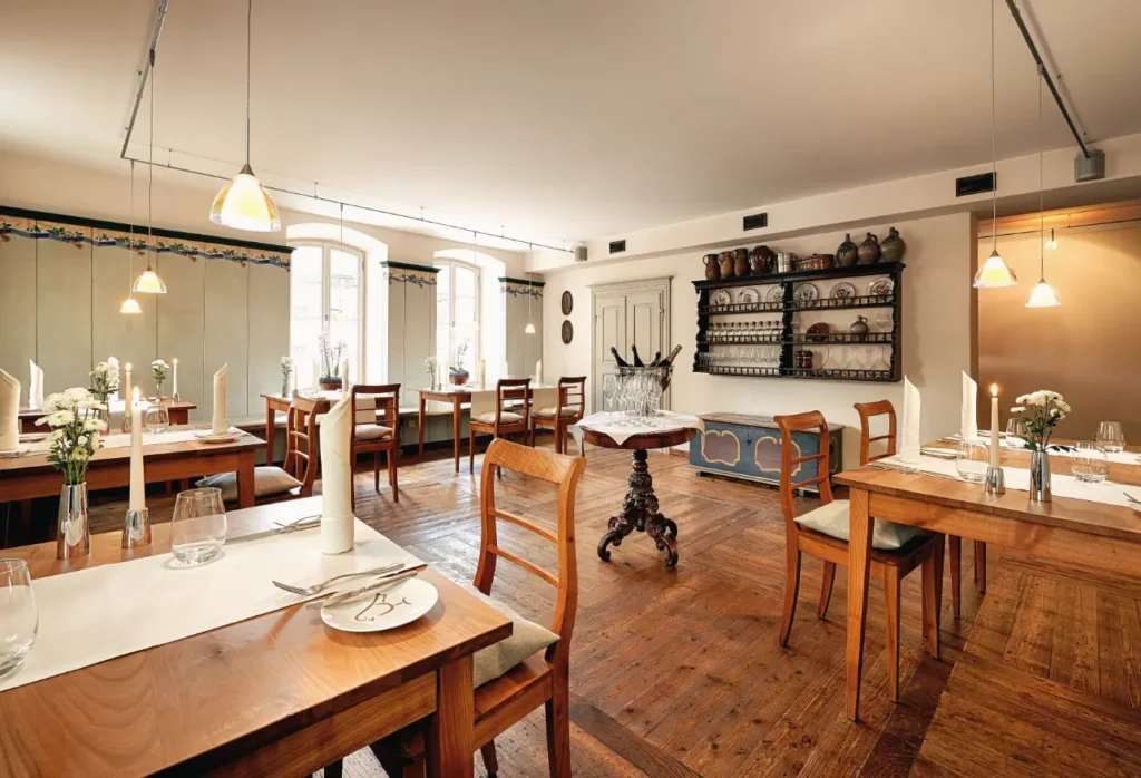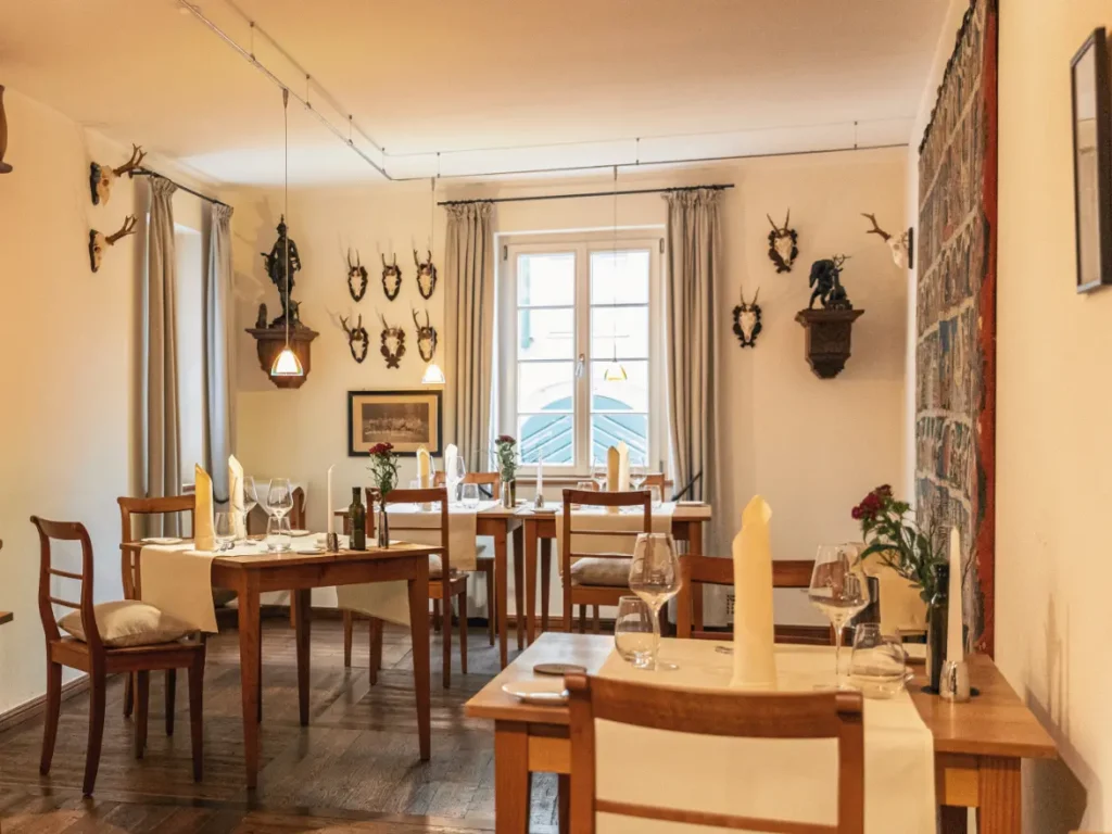 Einst Brauerei, nutzt unser Haus heute wieder eigenes Quellwasser. Im Sommer öffnet sich die Glaswand zum Innenhof, im Winter schafft der Raum mit Rokoko-Anrichte, Barocktür und einem Gemälde von Matthias Zinn einen Eindruck von Wärme und Ruhe.