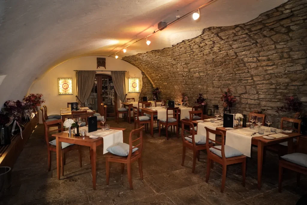 Im Sommer angenehm kühl, im Winter wunderbar gemütlich. Historischer Sandsteinboden, Bleiverglasungen und geheimnisvolle Details verleihen dem Ambiente einen mediterranen Geist.